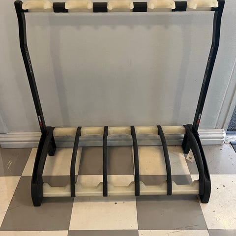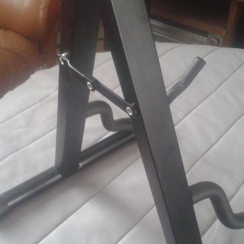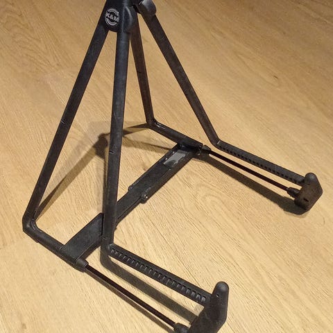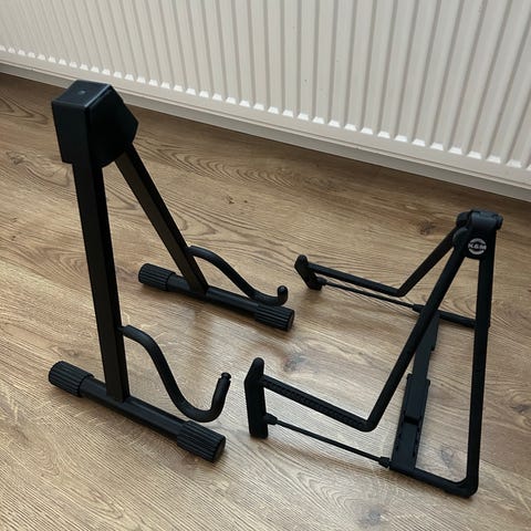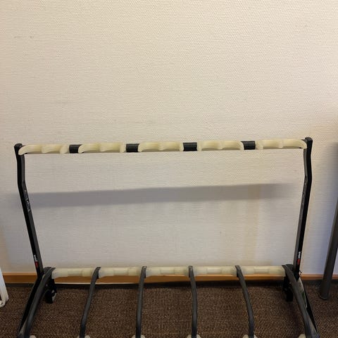 K&M-merkkinen teline. Tähän menee niin akustiset kuin sähkökitarat sekä bassot. Ollut kotikäytössä ja soittimien vähennyttyä myydään tarpeettomana eteen päin.