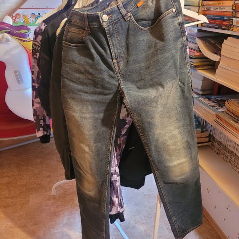Moottoripyöräilyyn tarkoitetut farkut sinisestä denim-kankaasta. XXXL- koko. Housuissa on useita taskuja edessä ja takana sekä vyölenkit vyötäröllä. Sisäpuolella on vuorikangas ja säätönapit vyötärön koon hienosäätöä varten. Irrooitettavat polvisuojat. Olleet jalassa noin 7-9 kertaa.