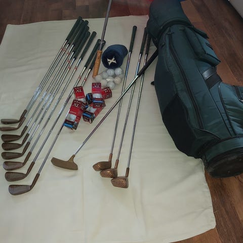 Vanhoja golfmailoja bägissä. Siitä aloittelevalle ja oikealta puolelta pelaavalle harjoitussetti.