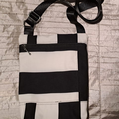 Miniunikko puuvillakankaasta tehty olkalaukku tuettu paksuhkolla tukikankaalla.