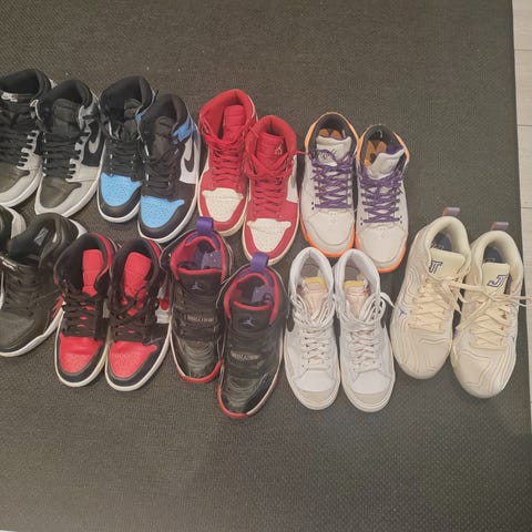 Air Jordan tennarit, koko 40. Väriltään pääosin mustat, vaalealla ja punaisella yksityiskohdalla varustetut varret. Nauhakiinnitys ja pehmustettu varsi. Soveltuvat arki- ja vapaa-ajan käyttöön.