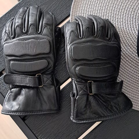Nahkaiset ajohanskat, säädettävä selkätuki ja säärisuojet. Retrotyyliset ajohanskat ovat mustaa nahkaa, pitkällä varrella ja vetoketjutaskuilla ranteen kohdalla. Sormissa ja rystysissä on pehmustetut ja tikatut vahvikkeet, jotka lisäävät suojaavuutta ajossa. Selkätuki on musta, leveä ja tarrakiinnitteinen, sisäpuolella hengittävä ja rei’itetty materiaali sekä useita tukinauhoja selän alueella. Irralliset ajohousujen alle laitettavat säärisuojat. Myydään yhtenä pakettina. XXL kokoiselle motoristille