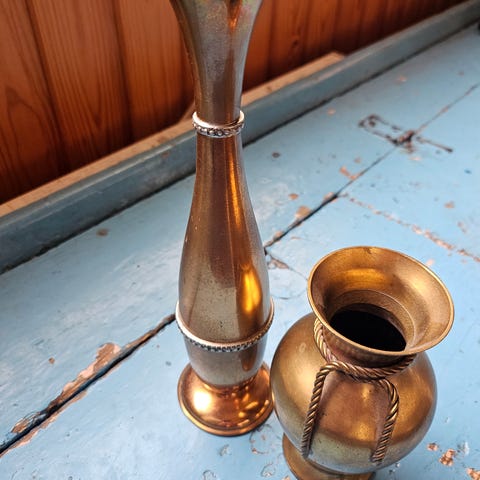 4 messinkistä kynttilänjalkaa. Kunto ok, ajan patinaa löytyy vähäsen.