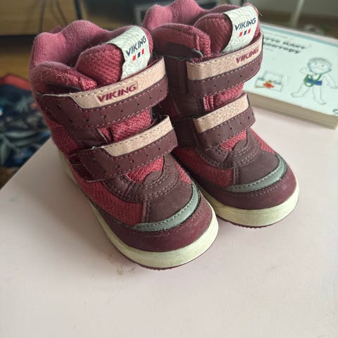 Viking poikien talvikengät, koko 23. Väri musta vihrein yksityiskohdin. Kengissä on kaksinkertainen tarrakiinnitys, korkea varsi ja vahvistettu kärki. Pohja on karkea ja suunniteltu pitävään otteeseen liukkaalla alustalla. Soveltuvat talvikäyttöön pojille, kengän koko 23.