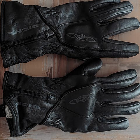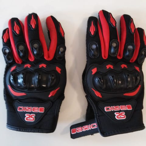 Musta nahkainen ajohanska, jossa on vahvistetut rystyset ja kämmenosa. Hanskassa on tarrakiinnitys ranteessa istuvuuden säätöä varten. Koko n. 8-9 tai M-L. Targa -merkkiset.
