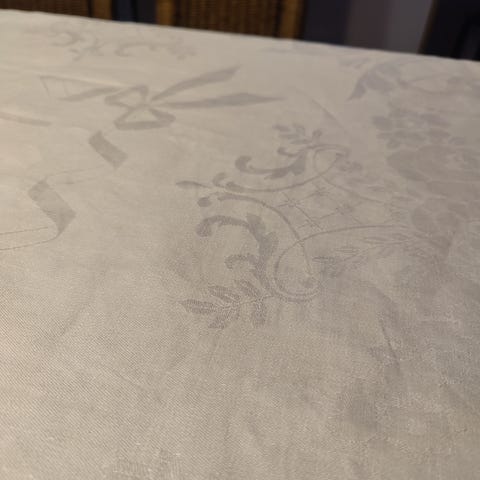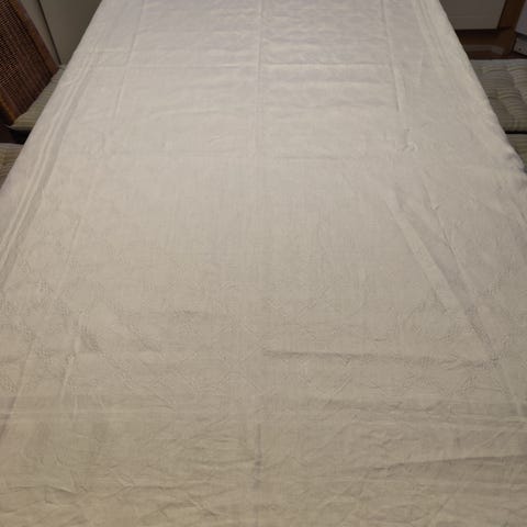Vahvasta pellavakankaasta tehty pöytäliina. Voisi toimia myös verhoilukankaana tai muissa käsitöissä.