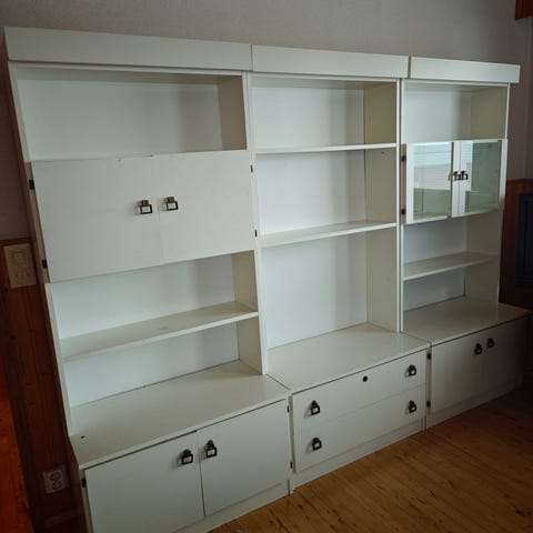 Annetaan kuvassa oleva hyllykkö. Yläosassa hyllyjä ja alhaalla kaappi. Korkeus 175 cm, syvyys 30 cm ja leveys 75 cm. Ehjät pinnat. Haku Haukiputaan keskustasta. Eläintalous. Ensimmäinen hakija saa.