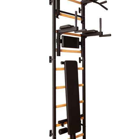Monipuolinen kuntoilupiste kotiin, mökille tai työpaikalle. Helppo asentaa ja mahtuu pieneen tilaan. Puuosat pyökkiä, muut mattamaalattua metallia. Mitat: 67 x 240 cm, käyttäjän maksimipaino 150 kg. Kiinnitys seinään. Fitbalance myy 2199 €.
