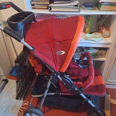 Matkarattaat. Kevyet ja menee suht pieneen tilaan. Selkänojan saa makuu asentoon. Iso kuomu. Ehjät, suurempi siistiminen jää ostajalle, kuitenkin perus siistissä kunnossa. Ollut säilössä kylmä varastossa talvet eli kankaat kunnossa.