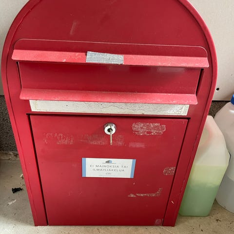 Mustaksi spraymaalilla maalattu metallinen postilaatikko. Avaimet lukkoon tallella. Mitat näkyvät kuvissa mittanauhan kanssa.