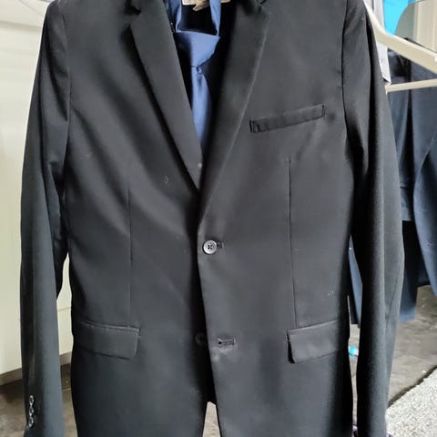 Yhden kerran käytetty poikien juhlapuku koossa 152 cm. Myydään settinä saman kokoisen valkoisen kauluspaidan kanssa, jota käytetty max. 3 krt. Puku on konepestävä, kaikki pesty käytön jälkeen.