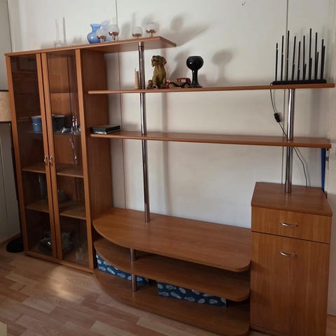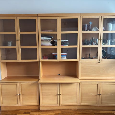 Kuvan siisti hyllykokonaisuus.