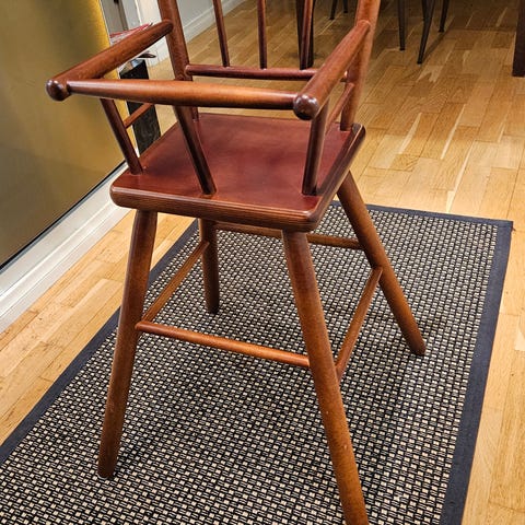 Syöttötuoli, puinen ja ruskea. Tuoli on muunneltava malli, jota voi käyttää sekä korkeana syöttötuolina että matalana pöytä-tuoliyhdistelmänä. Varustettu käsinojilla ja jalkatuella. Pyörät helpottavat tuolin siirtämistä. Sopii lapsen ruokailu- ja leikkihetkiin pöydän ääressä aikuisen valvonnassa.