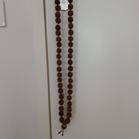 Myydään buddhalainen mala (rukousnauha), joka on tehty meripihkasta.
