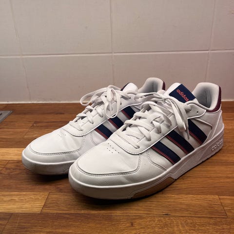 Adidas tennarit, koko 46. Väriltään mustat valkoisilla Adidas-raidoilla. Kuvista näkyy kengän yleinen kunto, mukaan lukien kulumaa erityisesti kantapäiden reunassa sekä pohjien kuviointi.