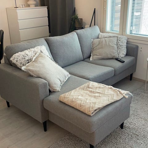 Myydään mukava ja pehmeä kangaspäällysteinen ruskea kulmasohva. Sohvan leveys ja pituus n. 234 cm. Korkeus 92 cm. Istuin syvyys n. 54 cm. Kunto muuten hyvä, mutta toisessa käsinojassa on pieni viilto. Noudettava itse. Menee kolmeen osaan kuljetusta varten.