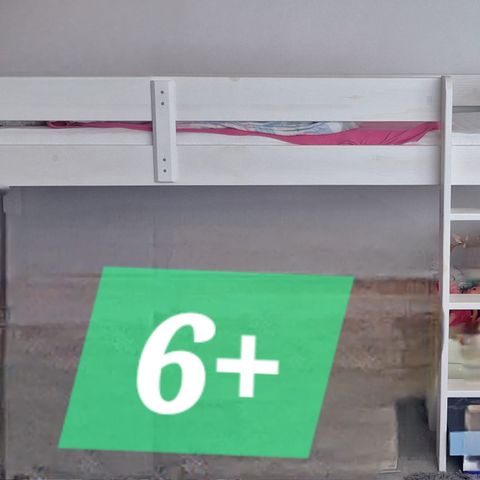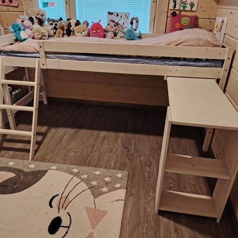 Korkea parvisänky, jossa kirjoituspöytä ja hyllyt alatasossa. Patja ei sisälly kauppaan.