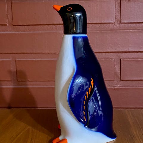 Tämä ikoninen Lomonosovin posliinitehtaan pingviini, joka on hieno esimerkki 1970–1986‑vuosien designista. Karahvissa on upea syvän koboltinsininen ja valkoinen väritys, jota täydentävät käsinmaalatut oranssit yksityiskohdat nokassa ja jaloissa. Pingviinin pää toimii karahvin korkkina. Tämä esine on täydellinen lisä Lomonosov-keräilijälle tai uniikiksi sisustuselementiksi retrohenkiseen kotiin. Se sopii mainiosti esimerkiksi liköörin tarjoiluun tai vain koristeeksi hyllyyn. Harvinainen löytö, joka kantaa mukanaan historiaa ja korkeaa käsityötaitoa.