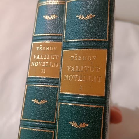 Kaksi Tshehovin novellikokoelmaa (1959). Yhteensä 12 euroa. Ostaja maksaa postikulut tai nouto Helsingistä.