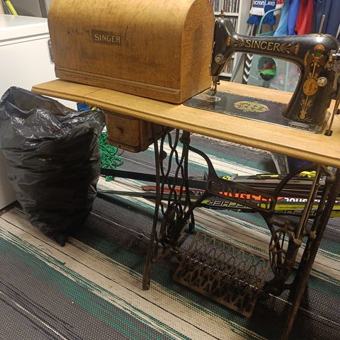 Singer ompelukone mustaa metallia. Koneessa on koristeelliset kultaiset kuviot rungossa. Sopii ompeluun tai esimerkiksi sisustuselementiksi.