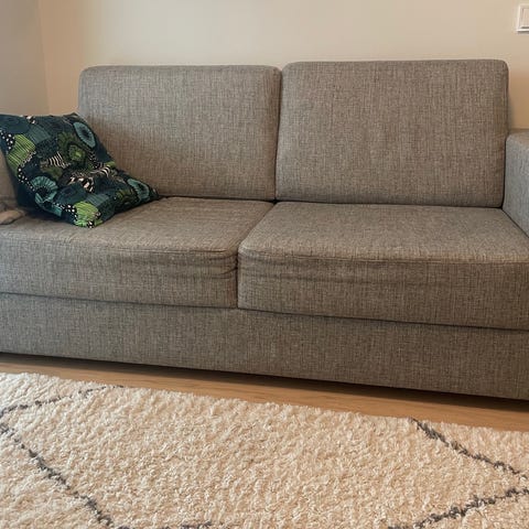 Sohva toimii hyvin sekä sohvana että vuoteena. Huomioithan, että jouset ovat painuneet kahdesta kohdasta, todennäköisesti lasten hyppimisen vuoksi. Tämä oli jo näin, kun ostin sohvan edelliseltä omistajalta. Sohva on kuitenkin edelleen käyttökelpoinen, ja kunto on huomioitu hinnassa.