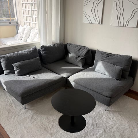 Myynnissä erittäin suuren suosion saavuttanut Ikean Söderhamn sarjan pieni kulmasohva käsinojilla. Ryhmä sisältää 2 x 1:n istuttava osa, kulmapala ja 2 x käsinoja. Kaikkien osien rungot ovat ehjät. Ryhmää pystyy käyttämään myös ilman käsinojia, sillä ryhmän päälliskankaaseen ei ole tehty käsinojien reikiä. Päällisten väri: Leide harmaa / musta. Ryhmän kaikki päälliset ovat irroitettavissa pesuun. Runkojen päälliset mukaan lukien. Lisäksi päälliset ovat halutessaan vaihdettavissa. Huomioitavaa sohvan kunnossa: Kulmapalan toisessa sivussa pieni tahra. Ei näy päivittäisessä käytössä mihinkään. Ryhmän hinta: 649€.