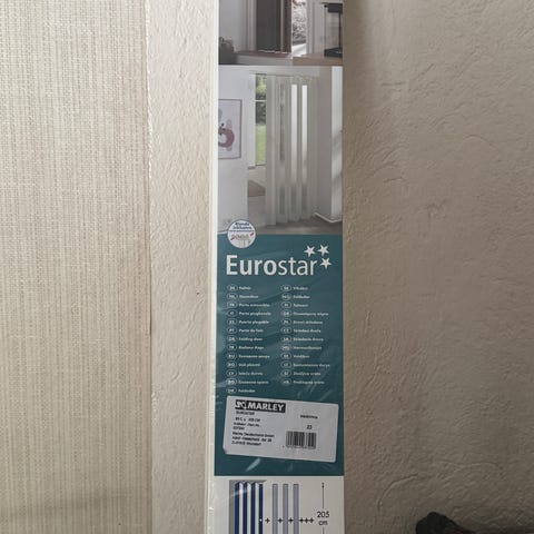 Paketissa oleva valkoharmaa (puunsyyt näkyy) muovinen taiteovi.