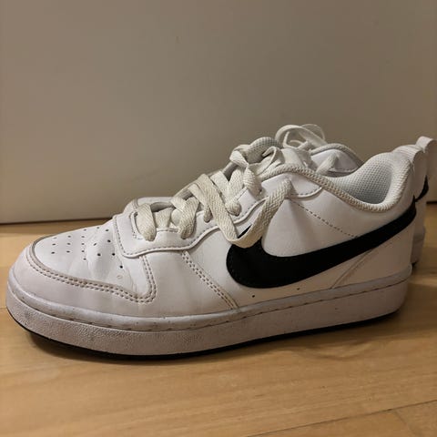 Nike lasten tennarit, koko 38, unisex-malli. Värinä valkoinen, jossa vaaleanpunaiset Nike-logot. Käytönjälkiä on nauhojen vieressä kulmissa, siksi halvalla.