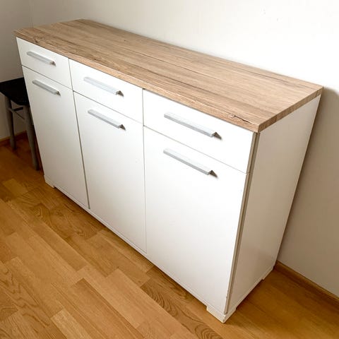 Valkoinen lipasto puutasolla 2 laatikkoa ja 2 kaappia