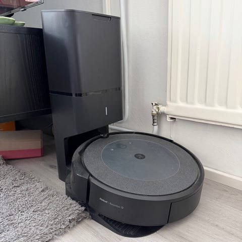 iRobot Roomba j7+ robotti‑imuri tyhjennysasemalla ja runsaasti tarvikkeita