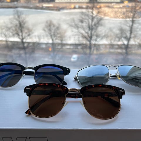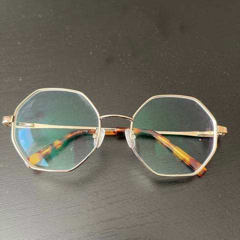 Todella hyväkuntoiset lasit vahvuuksilla. Oikea -7,25, cyl -1, ax 13. Vasen -4,25, cyl -0,75, ax 180