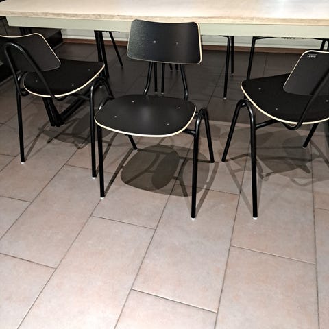 Iskun klassikko, istuinosa ja selkänoja valk.laminaattia, maalattu metallirunko.Istuinkorkeus 45 cm.