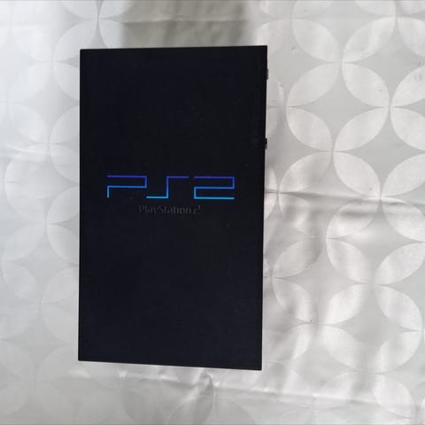 Ohut PS2-malli. Konsolissa liitännät mm. ohjaimille, muistikorteille, verkkokaapelille sekä AV-videokaapelille. Mukana virtalähde virtajohtoineen, AV-kaapeli televisioon liittämistä varten, kaksi ohjainta (off-brand, not oroginal.) sekä kaksi muistikorttia.
