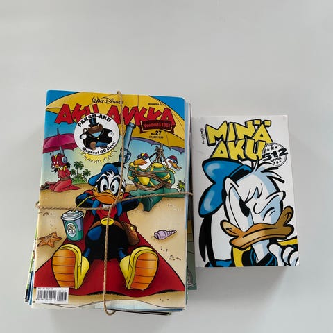 Annetaan laatikollinen vanhoja Aku Ankka -lehtiä, pääasiassa 70- ja 80-luvuilta. Kunto vaihtelee hyvästä paljon luettuun.