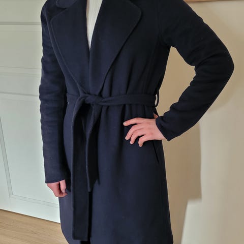 Polvimittainen, tilavat etutaskut. Kaunis kaulus ja istuva malli hartioista ja hihoista. Neppari + vyökiinnitys.