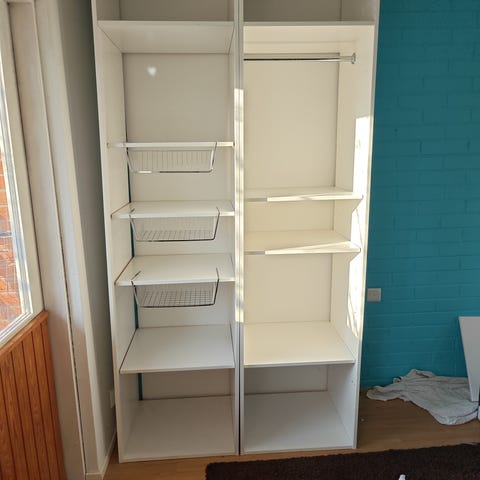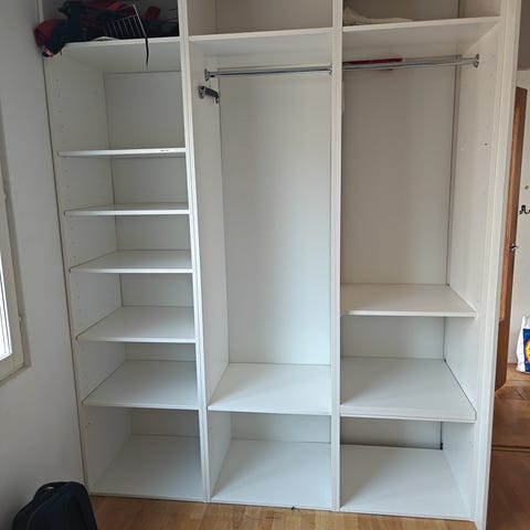 Keskellä olevat hyllyt leveys 130 (keskellä olevat hyllyt saa helposti irrotettua, muutoin kaappia ei saa esim kahteen osaan.