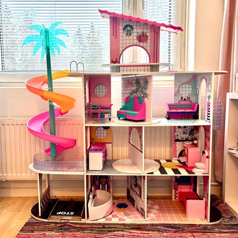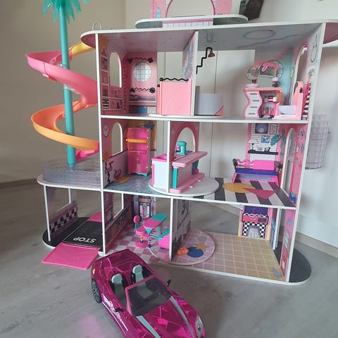 Iso L.O.L. Surprise nukkekoti on monikerroksinen leikkitalo, jossa on useita huoneita ja parvekkeita. Nukkekodissa on värikäs vaaleanpunainen ja monivärinen sisustus, liukumäki, palmupuukoriste sekä erilaisia kalusteita, kuten kylpyamme, sänkyjä, pöytiä ja keittiökalusteita. Rakennelma on pääosin muovia ja kartonkia. Sopii L.O.L. Surprise -nukeille ja muille pienille nukeille ja hahmoille sisäleikkeihin. Tämä ostettu meille uutena joten vielä hyvä luntoinen ja kaikki osat tallessa.