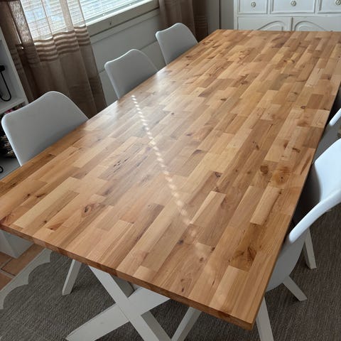 Puinen jatkettava ruokapöytä + 6 tuolia