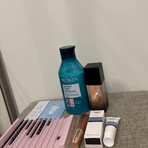 Meikkipaketin , jossa on monta erilaista tuotetta kuten huda beautyn peiteaine, jossa on kaikki sävyt , kynsilakkoja ja ripsiväri . Mukana myös aurinkolasi , kaulakoru ja täysin uusi huda beauty easy bake puuri sävyssä cupcake ja kaikki mitä kuvassa löytyy . Osa on käytettyjä ja osa täysin uusia