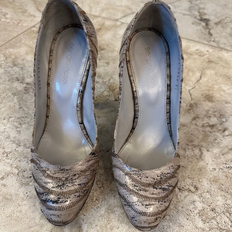 Käärmeenahkaisilla koroilla varustetut kengät Sergio Rossilta.Erittäin hyvä kunto, pieniä käytön merkkejä.Kaikki tuontiverot ja -maksut kuuluvat ostajalle.Oikeuksistasi ja velvollisuuksistasi lisätietoja saat tutustumalla Catawiki Ostajan ehtoihin.