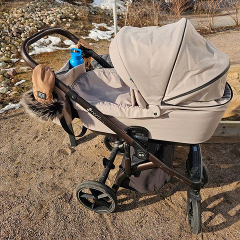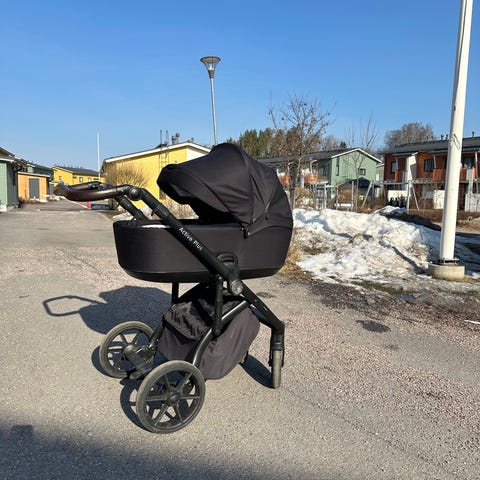 Käytön jälkiä on, kahdella lapsella ollut käytössä, pidetyt rattaat. Hyvin on loskassa ja mudassakin kulkenut👍