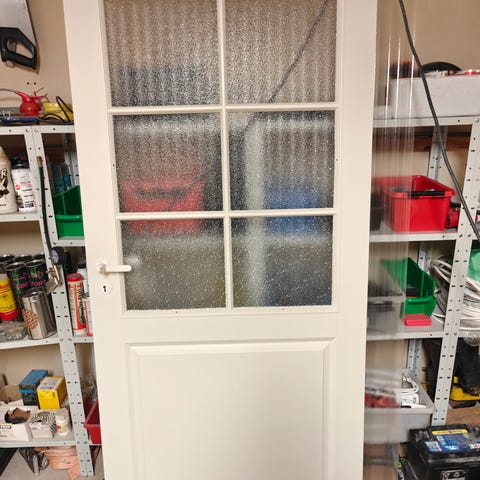 Ostetaan väliovi lasilla ruudukko. Oven koko pitäisi olla n. 85 cm x 205 . Eli 9 x 21 sopisi.