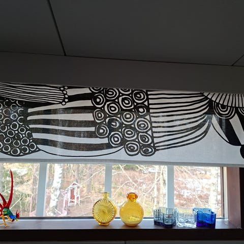 Marimekon Siirtolapuutarha kankaasta ommeltu verhokappa kapealla rypytysnauhalla.