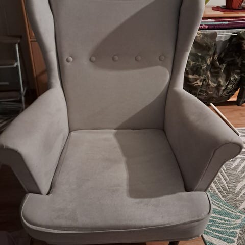 Hyväkuntoinen nojatuoli, päällinen nahkajäljitelmä sisustuskangasta. Korkeus 115cm, syvyys 80cm, leveys 80cm. Haku Kurkimäestä. Maksu käteinen/mobilepay. Myynnissä myös muualla.