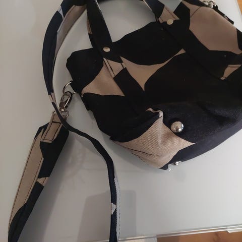Marimekko kangaslaukku naisille. Musta laukku, jossa sävyssä sävyyn kukkakuvioitu kangas ja irrotettava, leveä olkahihna Marimekko-logolla. Laukussa vetoketjusuljenta ja lyhyet kantokahvat. Sopii arkilaukuksi ja pienten tavaroiden kuljettamiseen.