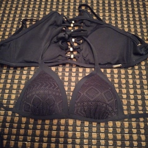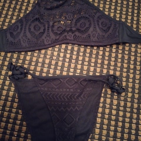 Tyttärellä hetken käytössä olleet bikinit. Irrallisella narulla yläosan keskeltä sidotaan niskaan