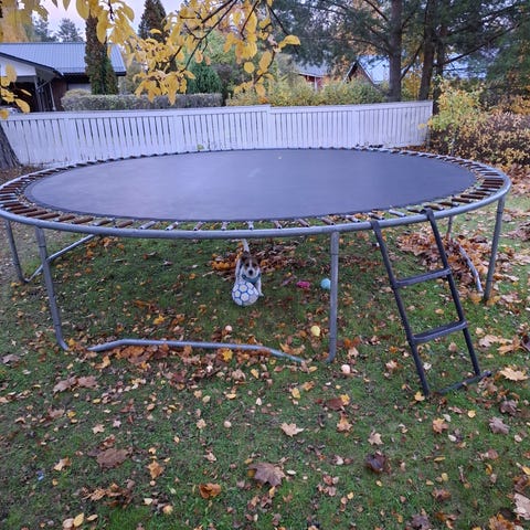 Trampoliini turvaverkolla. Pyöreä malli, jossa metallinen runko, jousitus ja hyppymatto. Mukana myös turvaverkko ja pehmusteet runkoputkien ympärillä. Soveltuu pihalle tai terassille asennettavaksi, kunhan alusta on tasainen ja tukeva. Ollut reilut 10v ulkona katettuna, runko yllättävän hyvässä kunnossa. Muutamia jousia irti ompeleista, turvaverkko ja reunasuoja huonoja. Vielä kyllä ollut päivittäisessä käytössä eli toimii tuollaisenaan tai, jos haluaa kunnostaa, niin ompelemalla ja nippusiteillä saa vielä elinaikaa tai vaihtaa alustan ja verkot vanhaan runkoon. Oli ehkä future sport Tokmannin valikoimasta joskus hankittu. Purettu valmiiksi ja pienet osat + jouset pussissa. Jos muutaman euron haluaa antaa, niin saa tarjota jotain, mutta itse en viitsi hinnoitella.