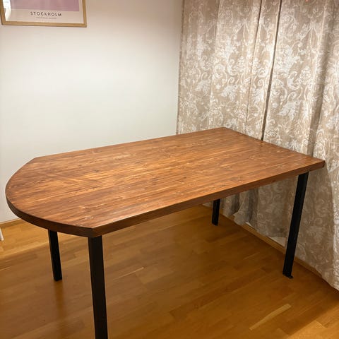 Pöytä on siisti ja tukeva, mutta pinnassa on pientä käytön jälkeä. Ei kuitenkaan vaikuta käyttöön.