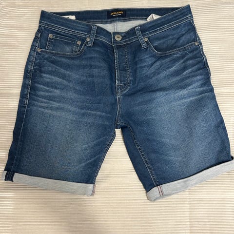 Jack & Jones farkkushortsit miehille, koko S. Sininen denim-materiaali, regular-malli. Klassinen viisitaskuinen malli, vyölenkit ja käännetyt lahkeensuut.