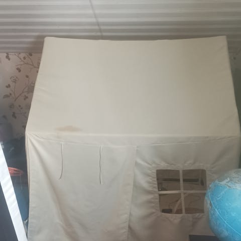 IKEA lasten leikkiteltta sisäkäyttöön, seuraaville pienille leikkijöille. Teltta on punasininen ja valmistettu kevyestä kankaasta, jossa on pyöreä kupolimainen katto ja avoin sisäänkäynti, jonka etuliepeet voi sitoa sivuille. Soveltuu lasten leikkeihin ja pienen leikkialueen rajaamiseen sisätiloissa.